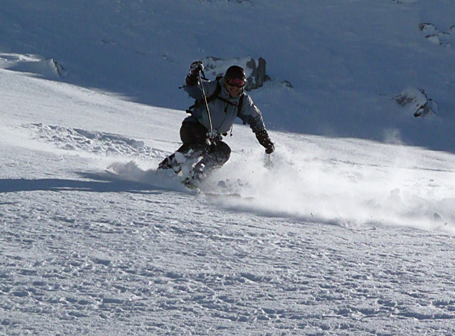 One usually skies down the ascent route, but (in safe conditions) the descent by the North Couloir is great (quite steep, about 40%).