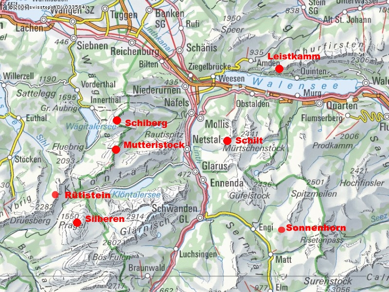 The following ski tours can be reached from Zurich city within 45 minutes by car. With the exception of the Leistkamm and the Forstberg (close to Rütistein), these tours are rather easy and are pretty safe (Schilt, Mutteristock, Schiberg, Sonnenhorn, Rütistein and Silberen). Here a few tips on these tours. [The German Version of this touring report can be viewed here.] Last, but not least, one should also mention the popular Small Kärpf above Elm, reachable with a one hour car drive from Zurich (not on the map below).