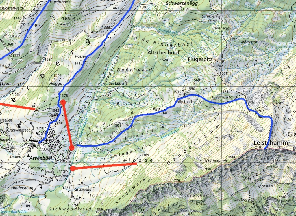 Above: Ascent and descent route to Leistkamm (couloir on the right is very steep, >40%!!)