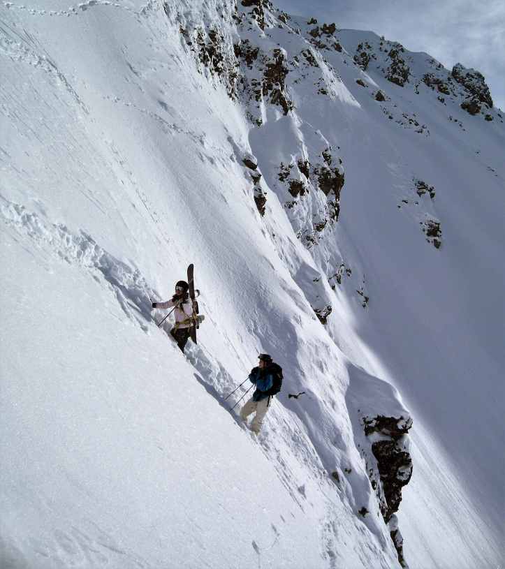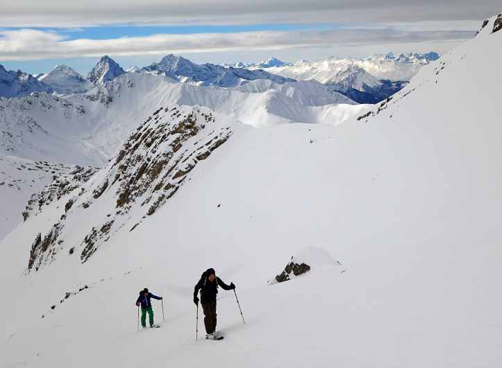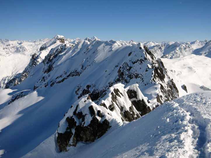 The 1000m climb to Fanezfurgga is easy and alway well tracked. From that little pass one can either cut across to Ducan Furgga or (if snow conditions are good and safe) ski down into the Ducan Valley and head up the Ducan from below. This route is mostly recommended on the way back as there is usually good powder all the way down to Ducan Valley. From Ducan Furgga the slopes get steeper and steeper until one reaches to ridge (point 2904) Northeast of the peak. Ski are usually left somewhere on the ridge as the last meters require some easy climbing. There are great views and, if at all, there will be very few people on the peak.