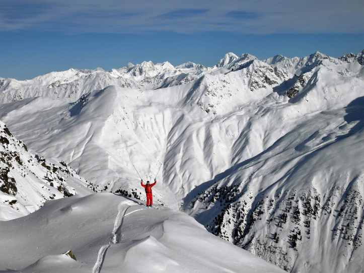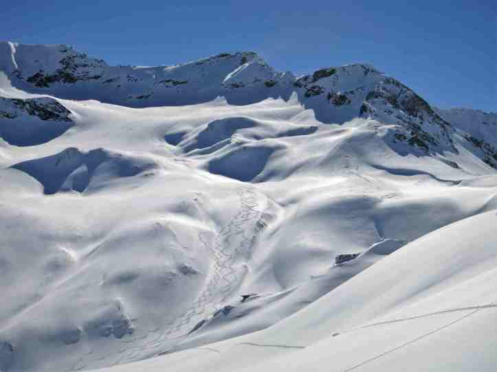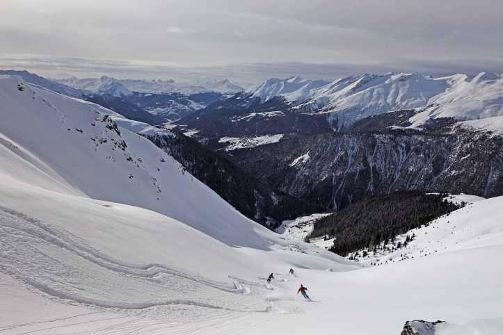 Skiing down the wide Büelen Valley usually offers good powder and there is plenty of room to lay new tracks here.