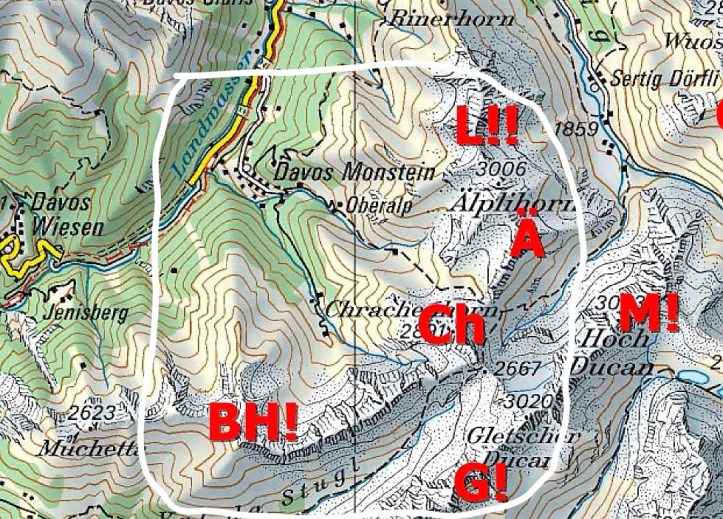 Älplihorn 3006m: Ä on my map, Route 518a, Monstein 1636m – Fanezmeder 2222m – Bärentälli -Älplihon 3006m, pretty easy tour with one or two steep parts