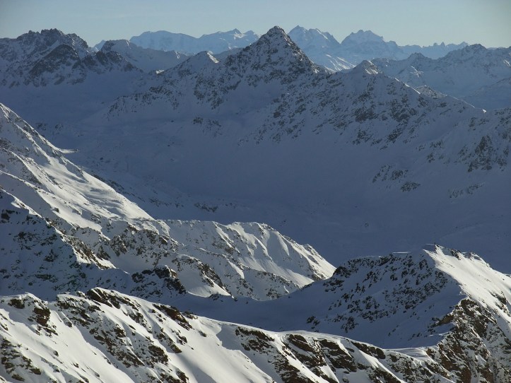 The Flüela Valley offers the most tours of the 3 side valleys (Sertig, Dischma, Flüela) around Davos. From the beginning of the year to May, the Flüela Pass Road is closed and one can only drive the car to Tschuggen (1937m). If the pass is open, the Flüela Scharzhorn (SH, 3145m), the Chlein Schwarzhorn (2967m, North of SH) and the Radüner Rothorn (R!, 3021m) are worthwile touring peaks. Also note that the Pischa Bahn might not always be running. So check before you want to climb the rewarding Pischahorn (2980m) or do the epic “Gatschiefer” Tour.