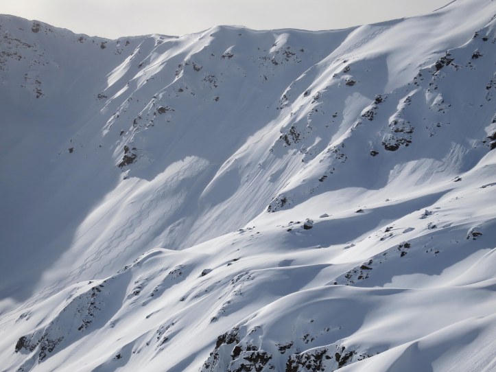 From the ski depot, there is almost always great powder down into the “Wöschchuchi” (“washing room”) to point 2623m. As seen here from above: