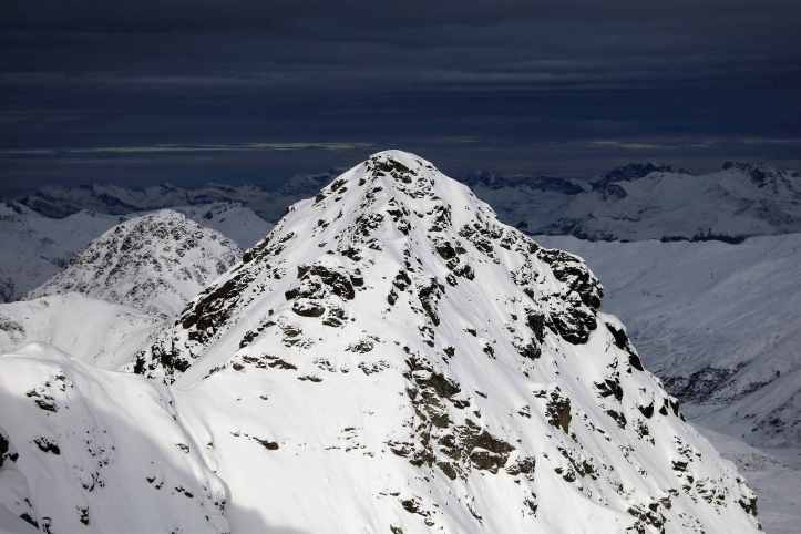 The “classic alpine tour “in the region. Thus there are always tracks on the way up. Follow the pass road for a while and then head up to the left. Once the ridge below Flüela Weisshorn is reached (2785m), one has to cross the North slope of the peak. Soon the “ski depot” at a small pass (2900m) is reached. Many tourers stop here and enjoy the view. The climb to the peak is a bit demanding and can be quite dangereous if the snow is hard. The mountain has two peaks, the peak to the South East is a few meters higher, but requires some climbing: so most people stop at the “Steinmannli” (rocks piled up).