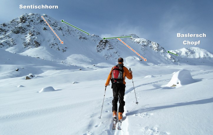 Putting on skins again, one can head back to the Flüela Valley over point 2771m (normal way) or via Jörihorn (1 hour longer and very steep uphill, need safe conditions). Here is a view of the two alternatives: