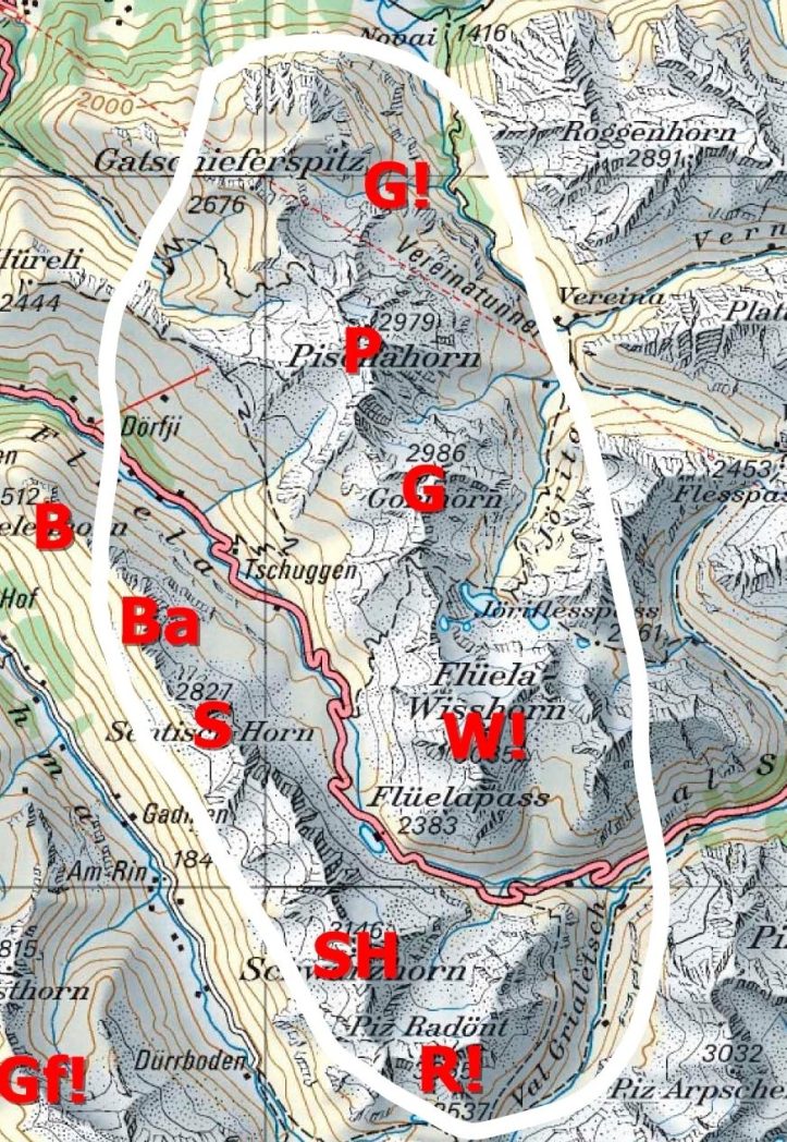I have covered most peaks in that region in a previous report which mostly I copy hereby. There is a detailed tour map below which has a few more peaks/routes than in the map above. Radüner Rothorn (R!) and Gatschiefer Tour (G!) is not in the tour map below.