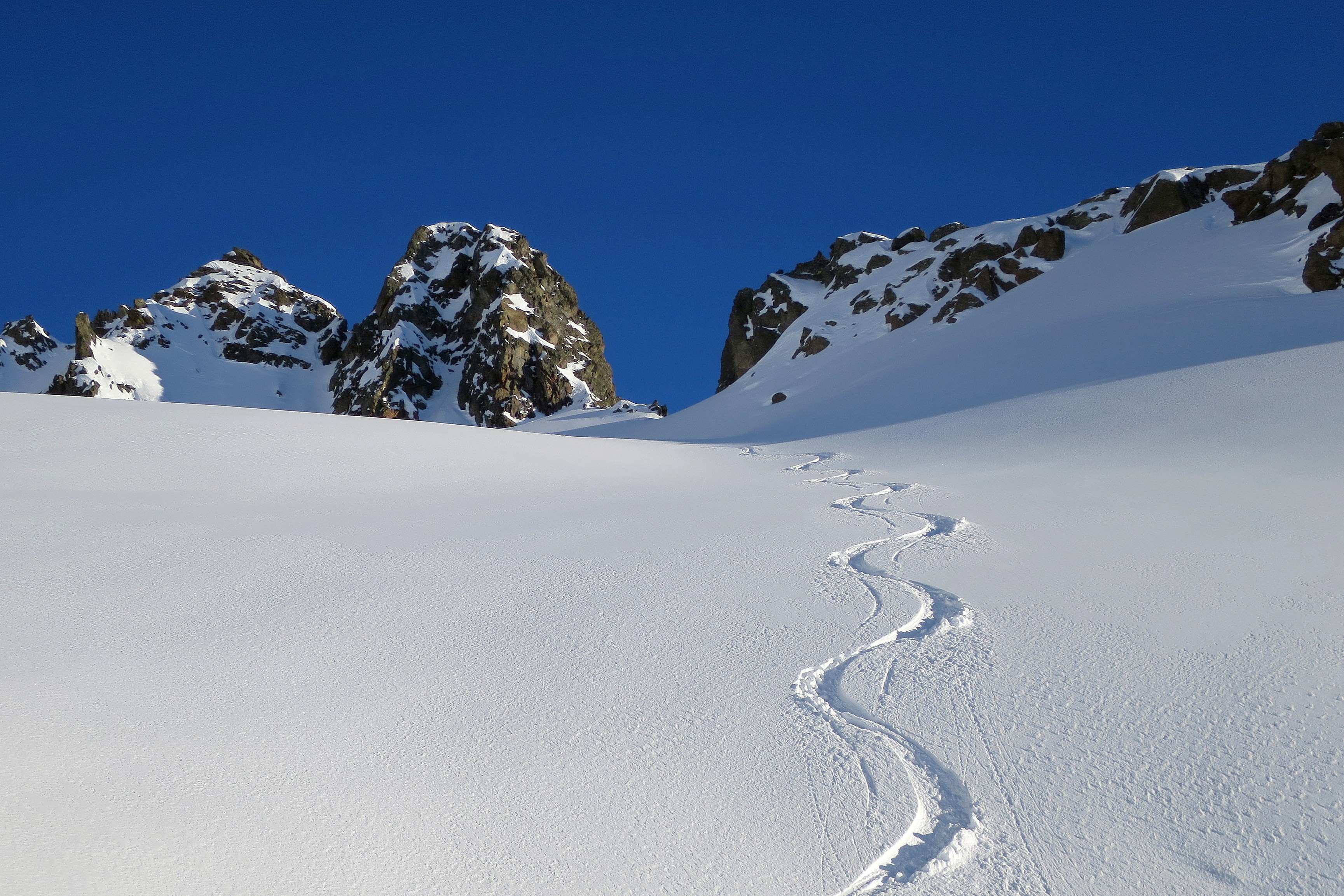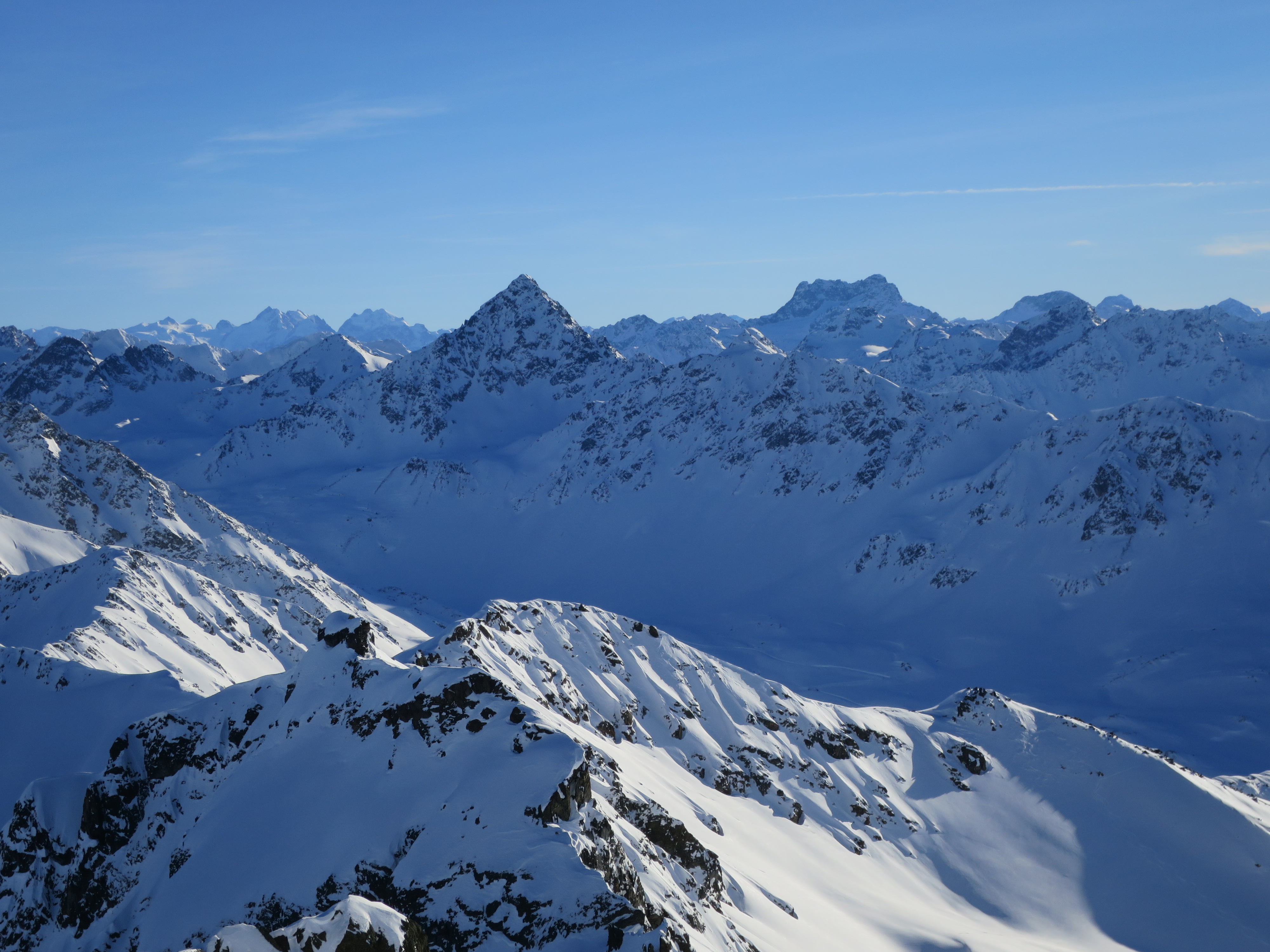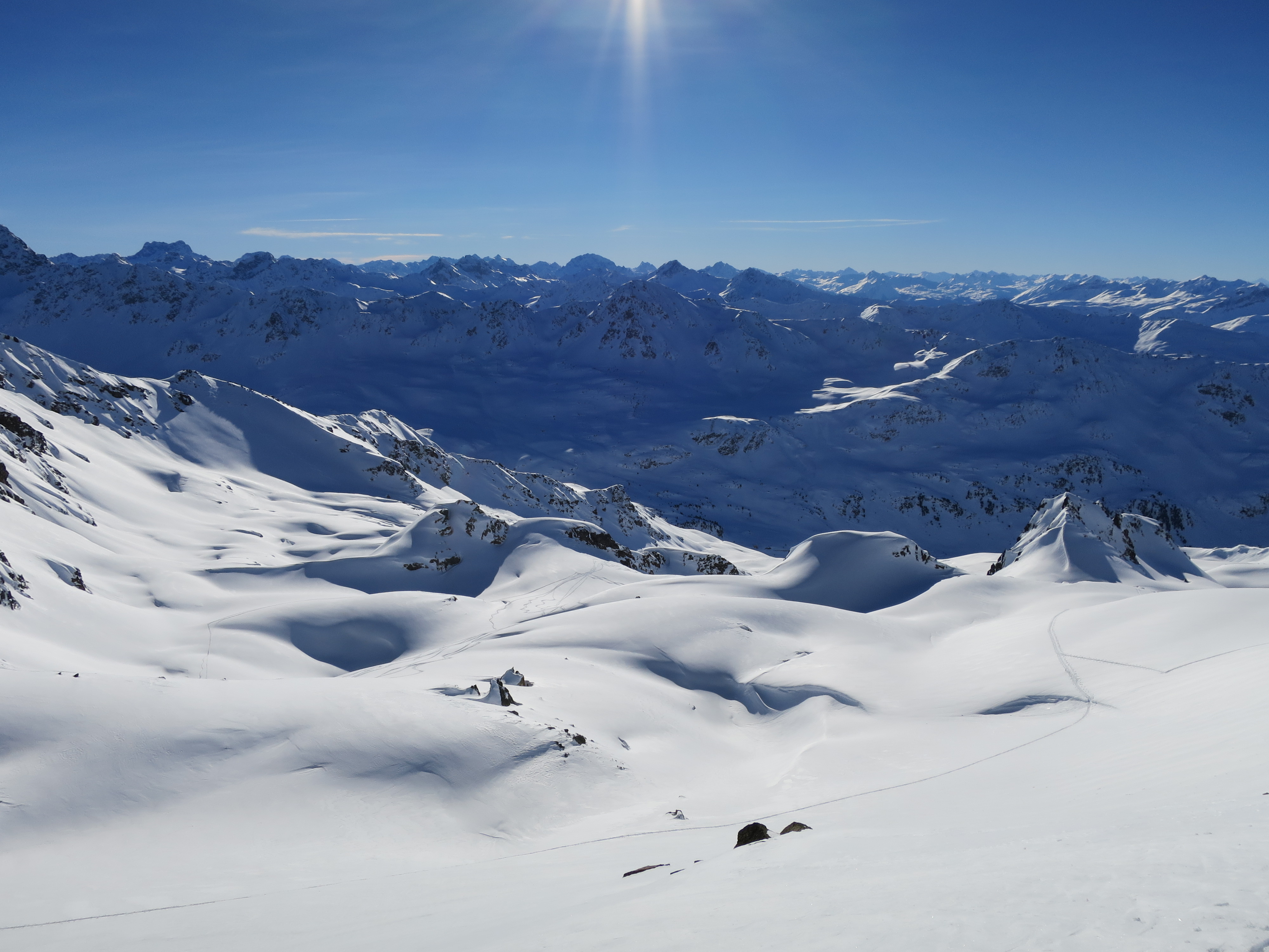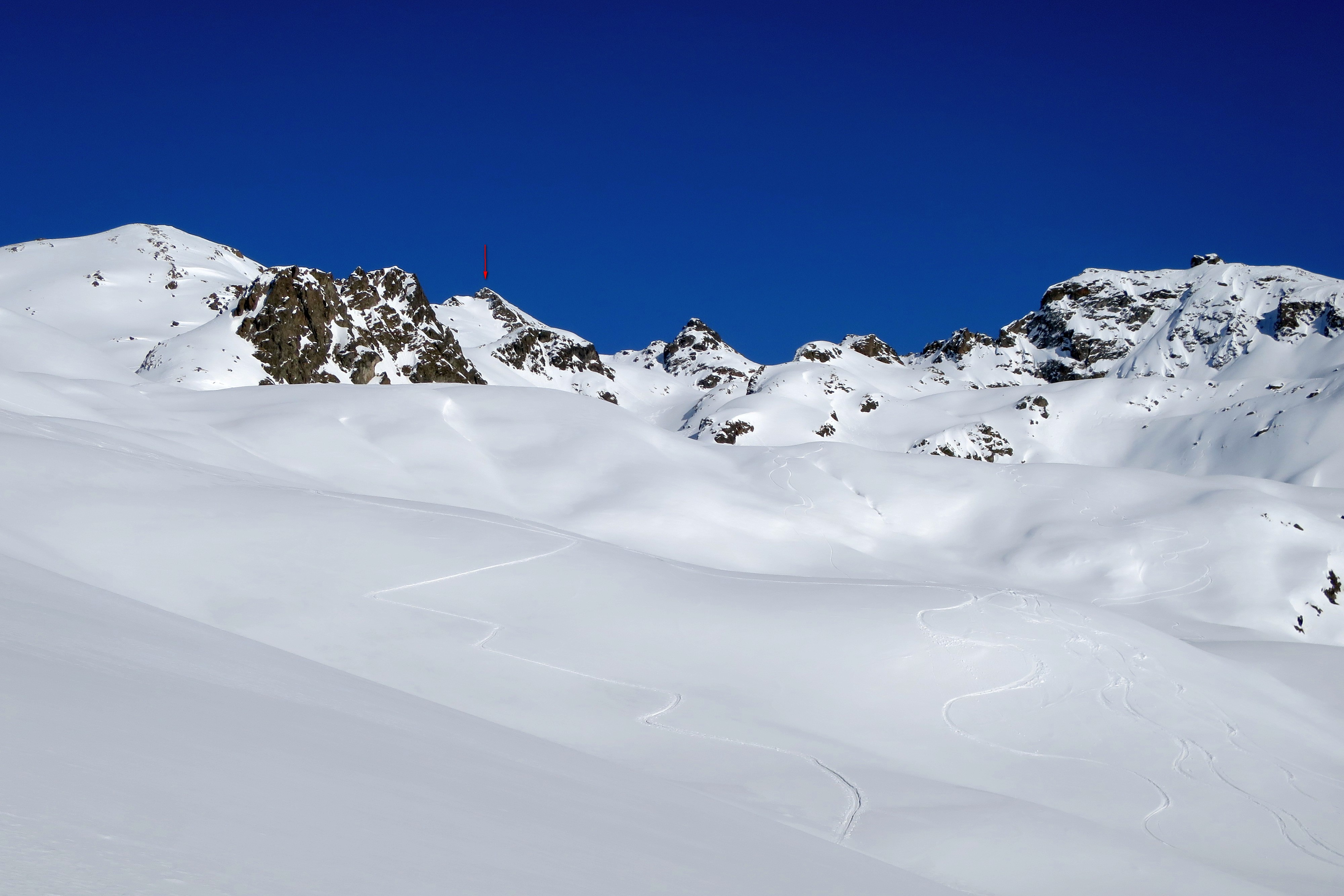 Isentällispitz is a few meter higher than the popular Pischa Horn. The tour start from Tschuggen (end of the Flüela Pass road during winter). One zig-zags up the steep Southwest slopes. Above 2200m the terrain gets less steep and its an easy climb to the saddle between Gorihorn and Isentällispitz. Follow route 555 on https://map.geo.admin.ch.