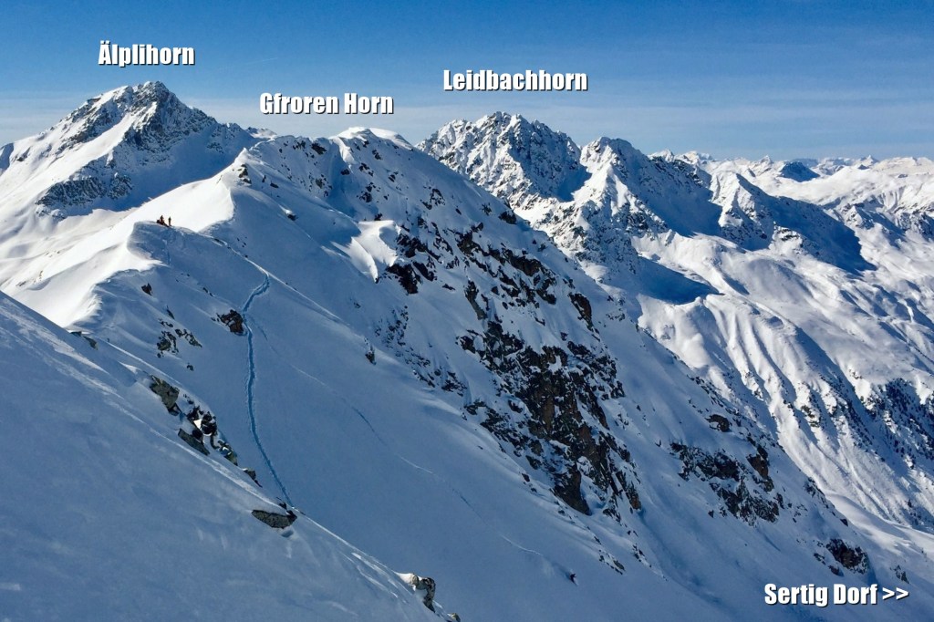 Das Gfrorenhorn, östlich von Sertig Dörfli, ist ein einfach zu erreichender Gipfel (Aufstieg 900m). Da die Aufstiegsroute zum grössten Teil im Schatten liegt, findet man hier – auch bei wenig Schnee – meistens noch guten Powder.