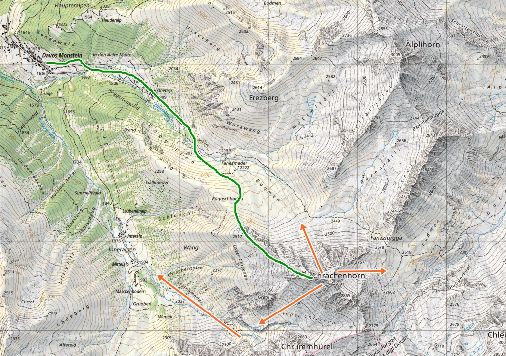 The Chrachenhorn is great alternative to the well travelled Aeplihorn (which is just over 3000m, and thus a popular target for ski tourers). Chrachen means “gorge” or “ravine” in Swiss German and the name probably comes from the very steep North and Southwest slopes of that peak. Both slopes are only skied a few times every winter!