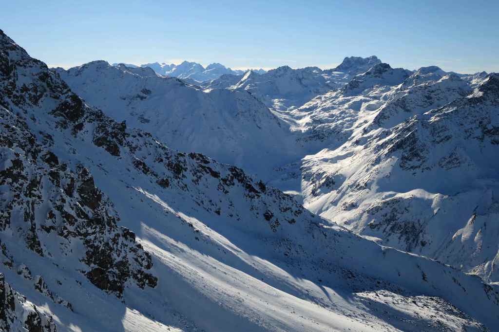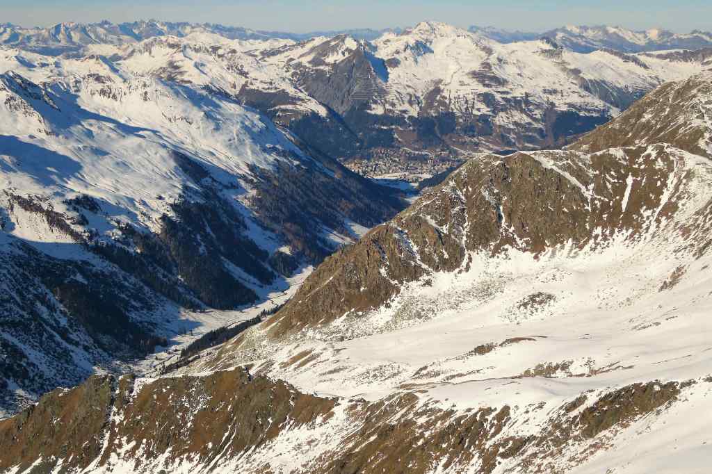 The view from the peak, high above the Dischma Valley, is quite spectacular with the Bernina range peaking out in the South West. Heading down can be tricky (Rocks!) depending on the snow conditions. At the bottom there are actually quite long and steep slopes leading down to the Flüela pass.