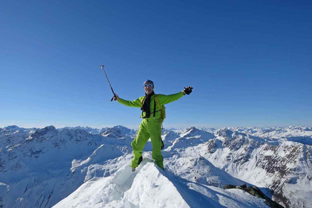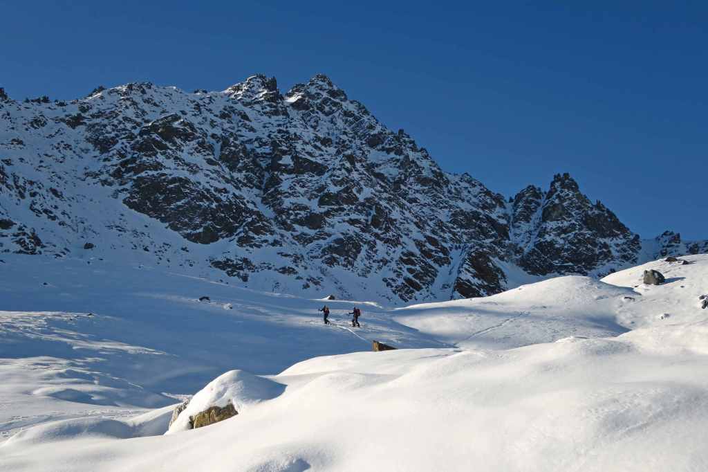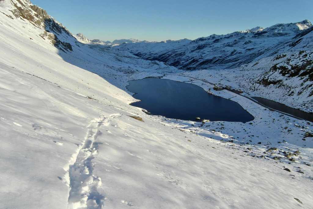 The Chlein Schwarzhorn is the “small brother” of the higher Flüela Schwarzhorn. The peak is climbed mostly in early winter, when the Flüela Pass road is still open. As most of the slopes here are in the shadow, even a modest snow cover makes this tour possible. But note that in the Flüela Region there are many rocks. So maybe do not bring your newest skis for this tour when doing it early in the season.