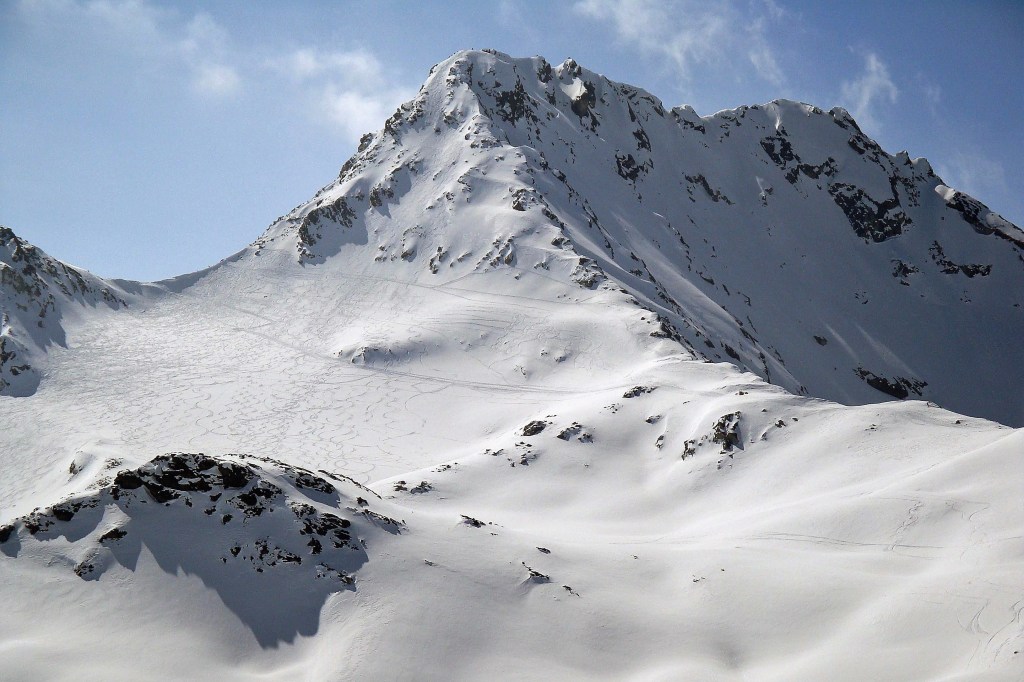 The 3019m high Gletscher Ducan is one the longer ski tours in the Davos. The peak can be reached from the picturesque village of Monstein or from the end of the Sertig Valley. While the peak can be popular at times, the slopes are wide (see first picture below) and the powder is usally great. The glacier below the peak is melting away quickly but rests can still be seen in summer (second picture).