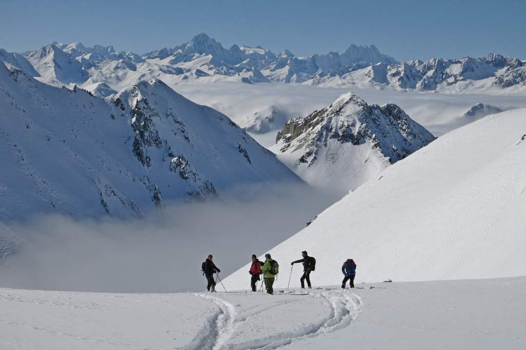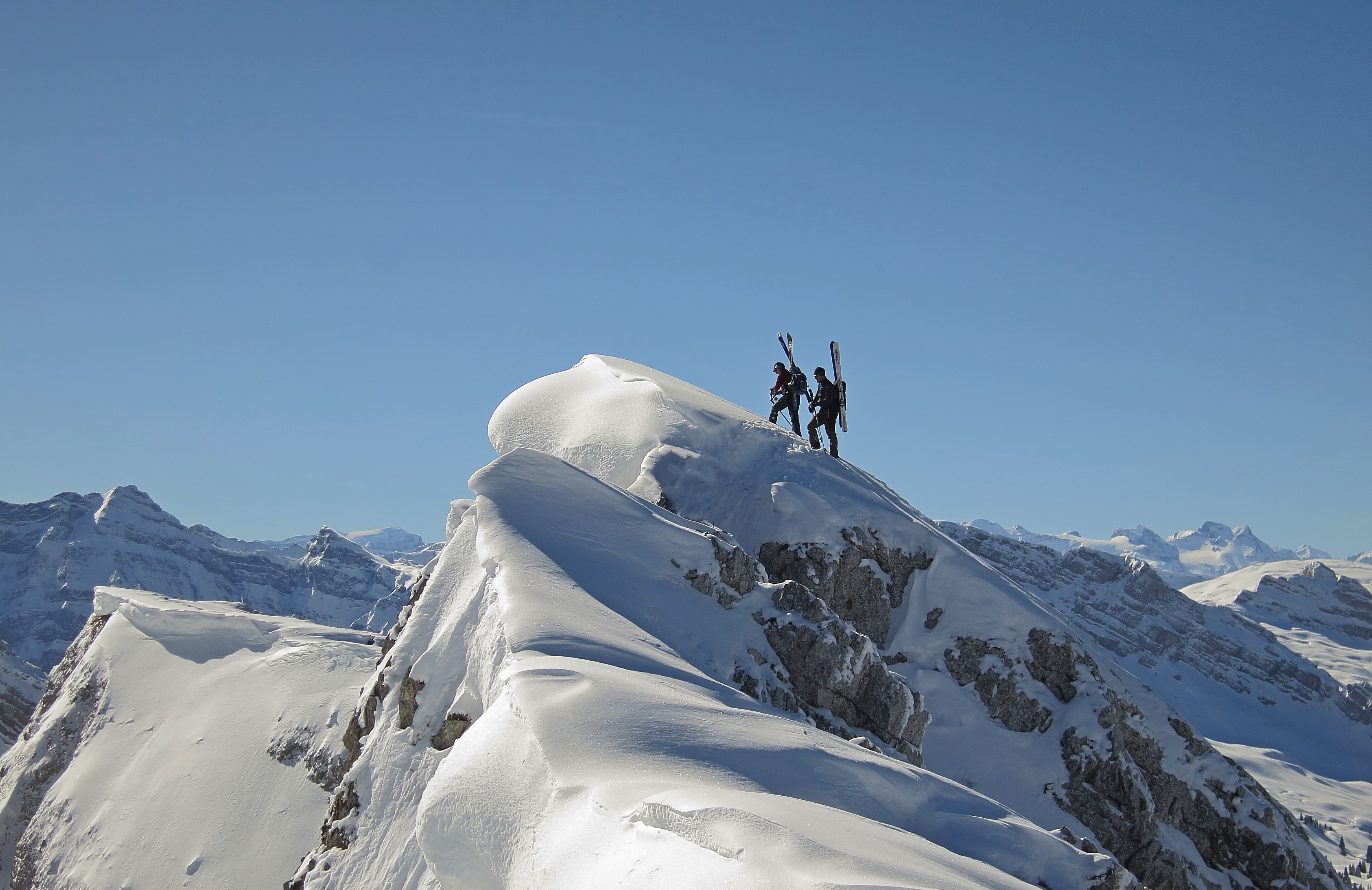 The Schiberg (“Ski Mountain”) is a smaller peak, easily reachable from Zurich. The ascent starts at the beautiful Wägital Lake (850m). For the last 100 meters, ski have to be carried and crampons are advisable. The scenery on Schiberg with its steep faces is stunning and one would not think that the peak is only 2000m high. Tour report here.
