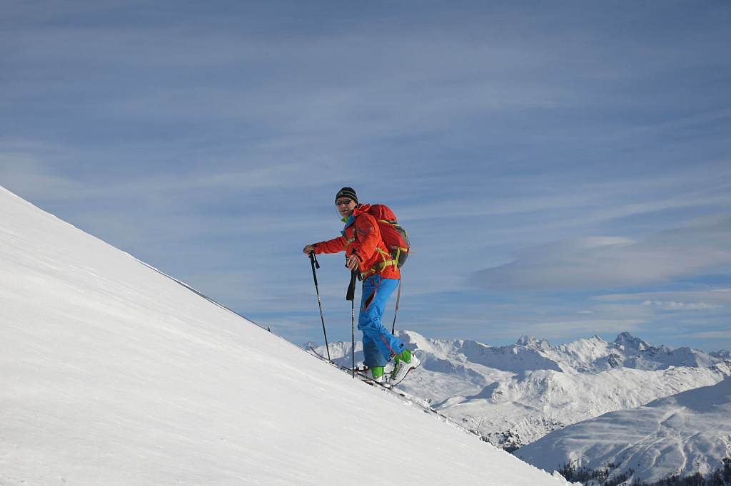 The Chörbschhorn (2650m) is a safe and one the most popular winter tours in the Davos Region. (In summer the peak is popular with mountain bikers as there is now a good downhill trail carved into the slopes). While the tour does not pose any challenges it is with a 1150m ascent not really short. The hut below the Chörbschhorn is a great place to relax on the small benches and enjoy the sun. As the route is heavily used the skiing down is advisable over either the Erb Alpen or via Lochalp directly down to Davos. See tour report here.