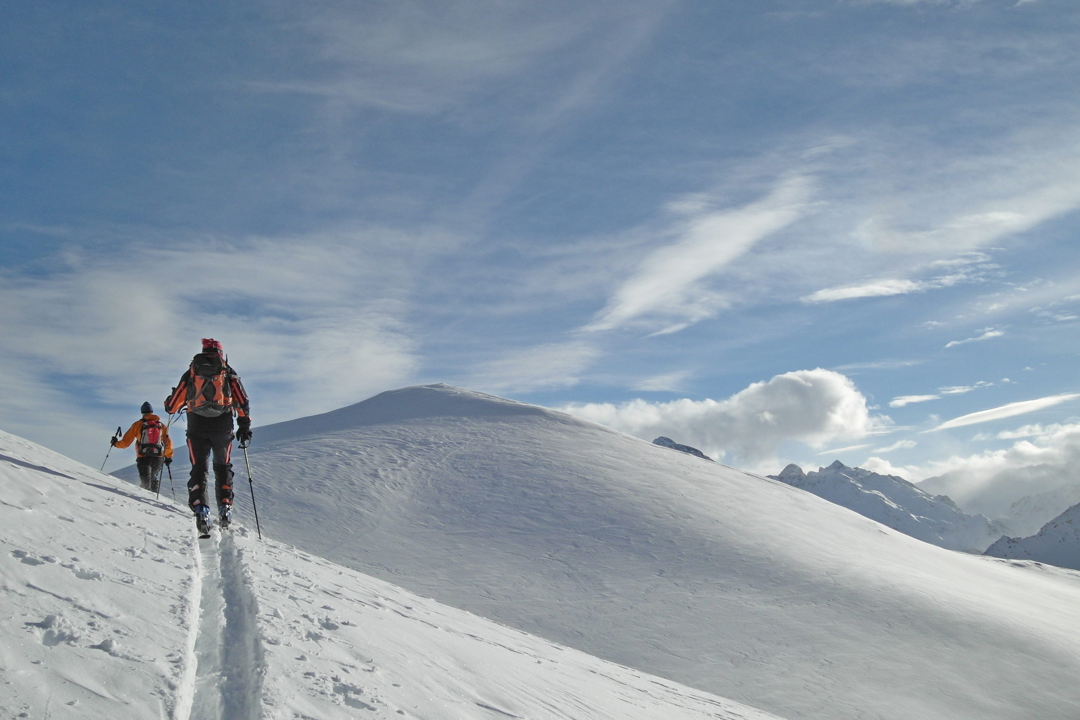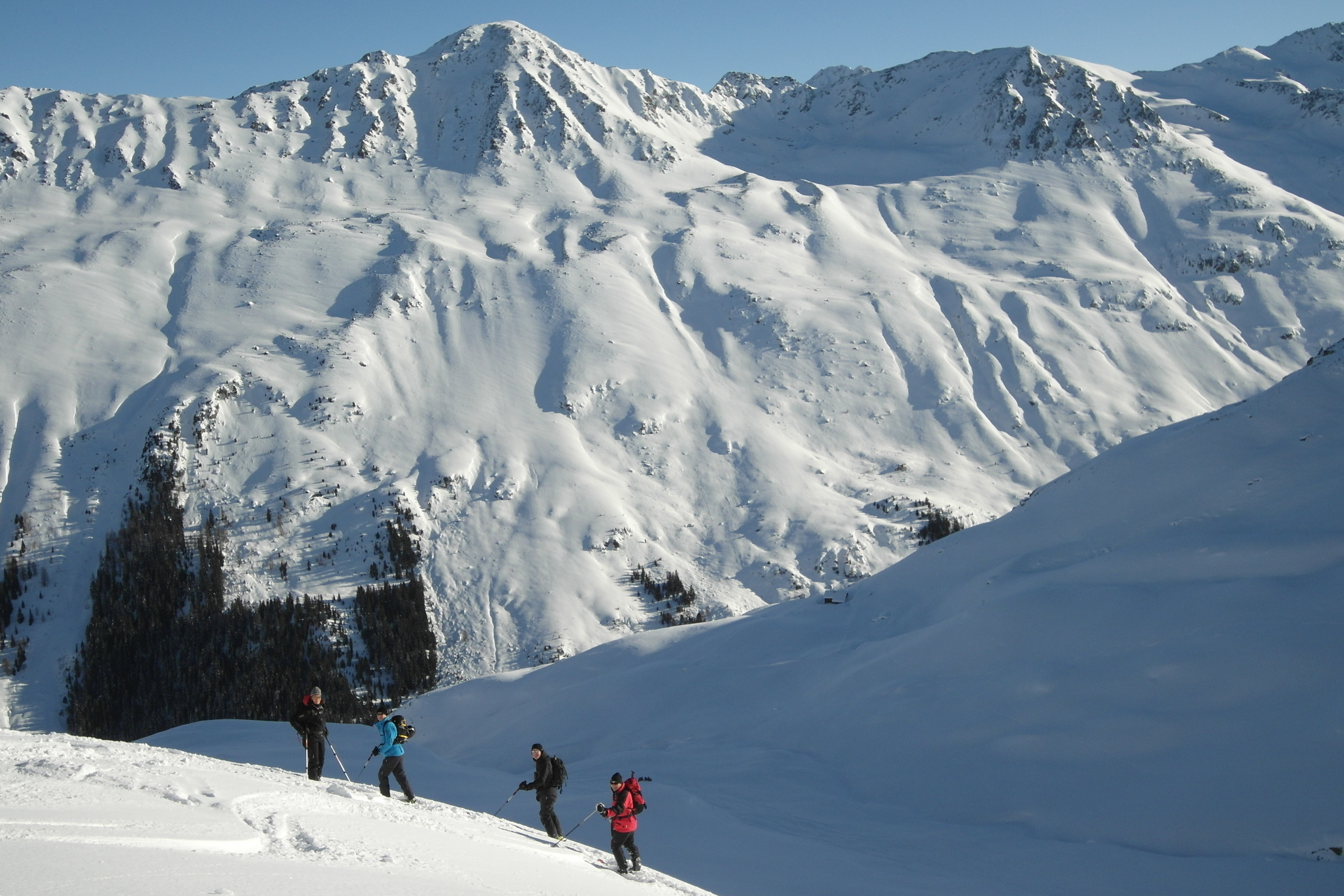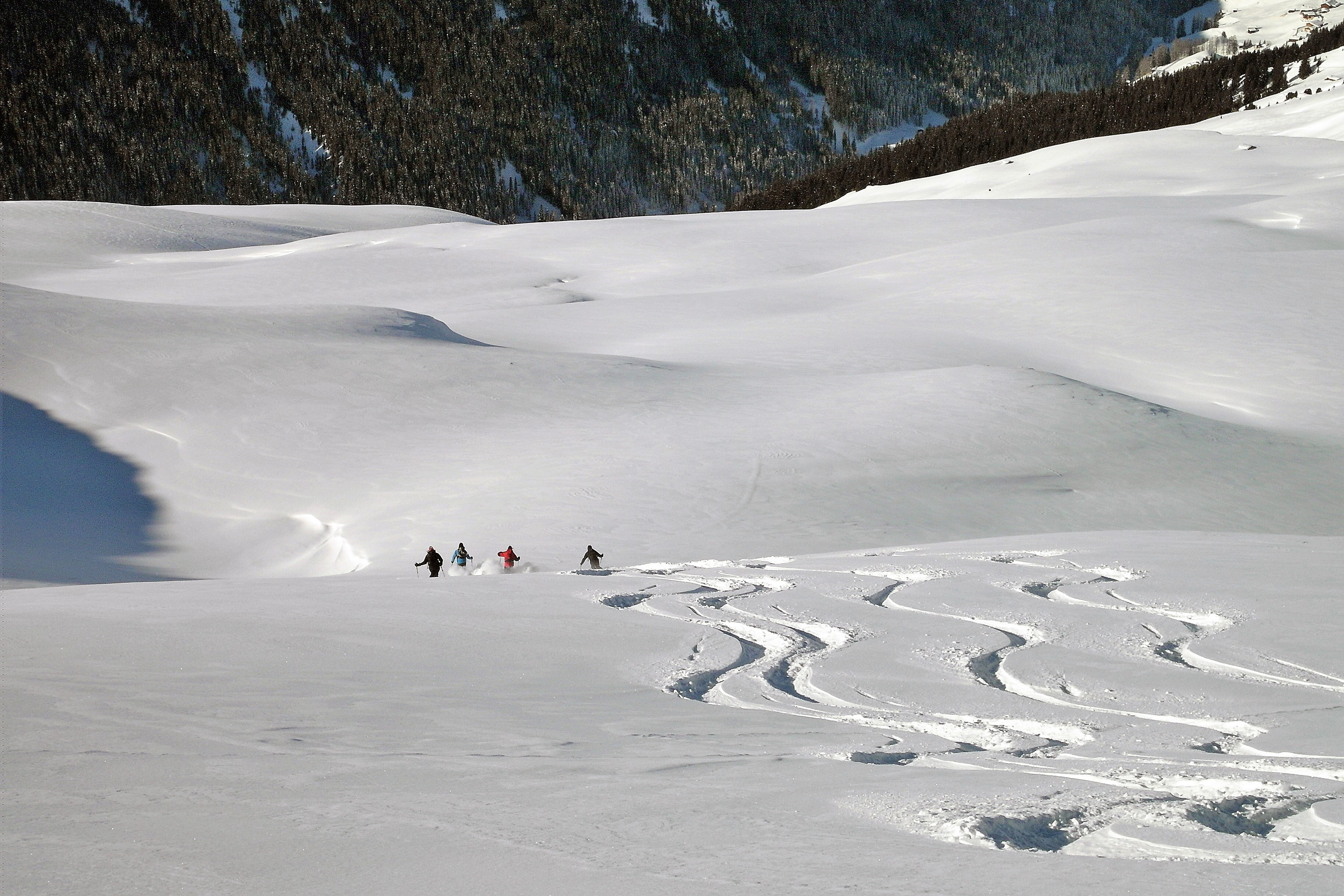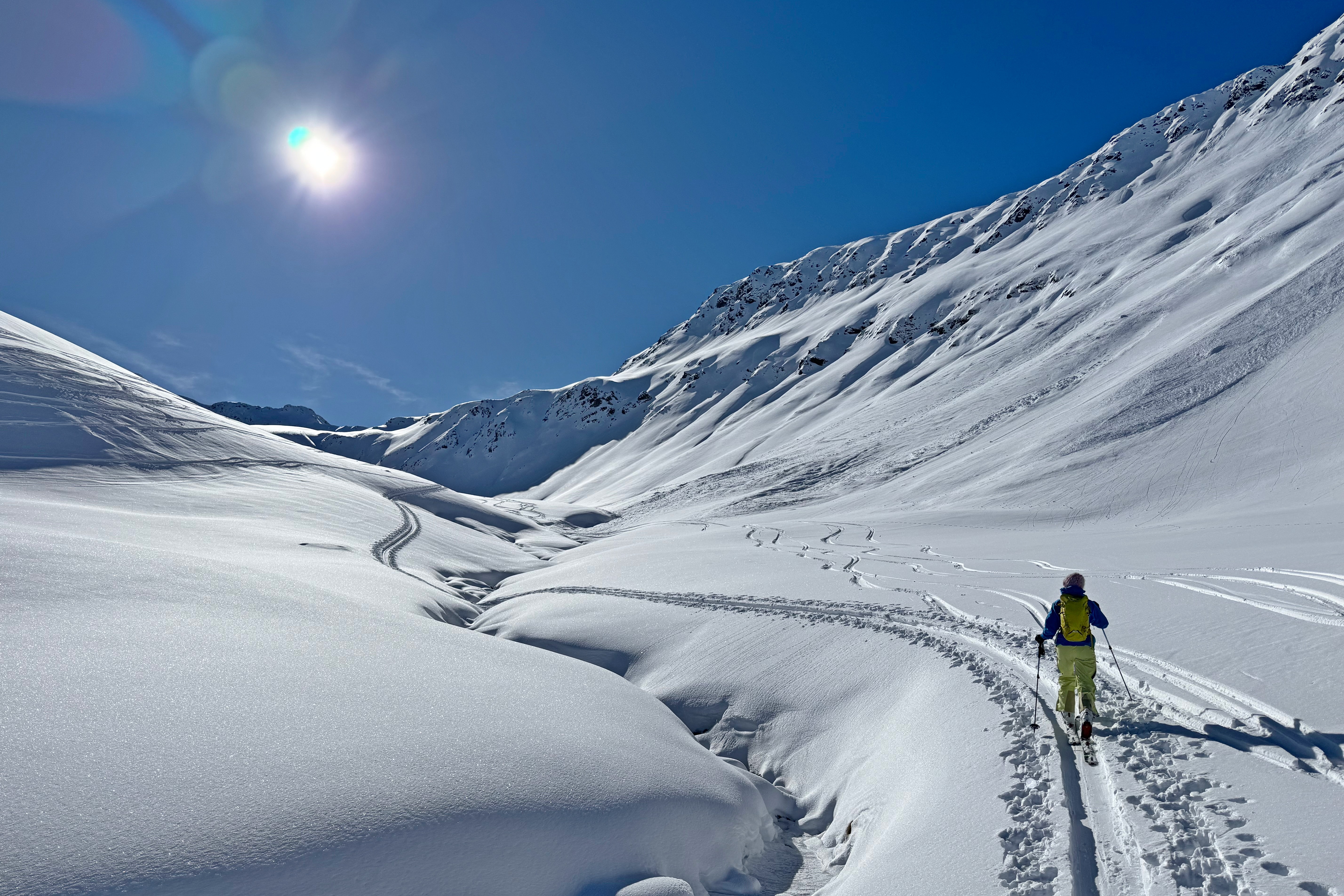 Den Rossboden erreicht man leicht vom Jakobshorn Gipfel (Einfachfahrt lösen). Meistens hat es eine Spur durch die ziemlich steile Flanke. Da dies süd-exponiert ist, ist sie wenig lawinengefährdet. Aufstieg ca. 20-30 Minuten. Vom Rossboden geht es dann durch wunderschöne Pulverhänge ins romantische Rüedischtäli. Man findet hier fast garantiert noch unbefahrenen Pulverschnee. Nun wandert man angenehm durch das einsame, sehr idyllische Tal auf die Tälifurgga (ob Sertig) und dann noch etwas weiter auf den kleinen Spitz nördlich von der Furgga. Wer jetzt schon genug hat, kann direkt nach Sertig Dörfli abfahren. Lohnender ist der nochmalige Aufstieg auf den Rossboden (nach einer leichten Pulverabfahrt). Die rassige Schlussabfahrt vom Rossboden direkt ins Dischma Tal war früher ein Geheimtipp. Die Route wird aber heute häufig gefahren. Die Abfahrt ist recht steil (>30 Grad). Auf sichere Verhältnisse achten!