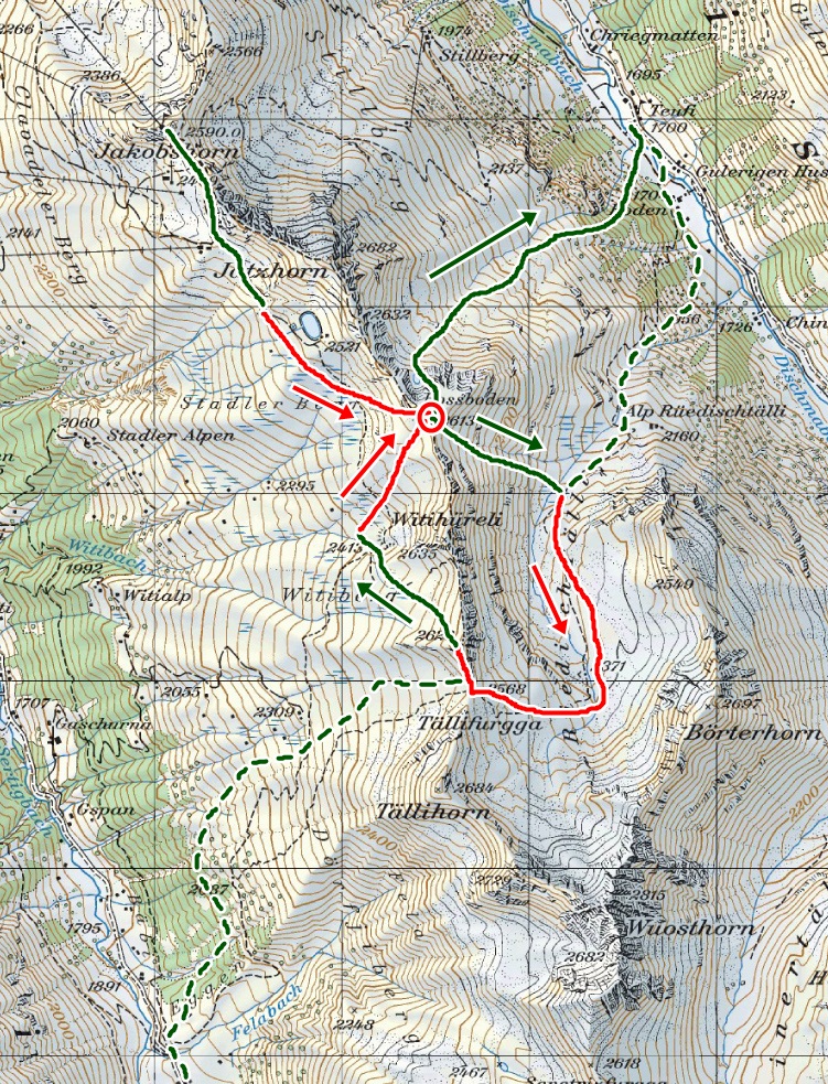 Dies ist eine schöne Rundtour mit tollen Abfahrten. Die Tour kann auch abgekürzt werden, in dem man von der Tälifurgga direkt ins Sertig abfährt (siehe unten).