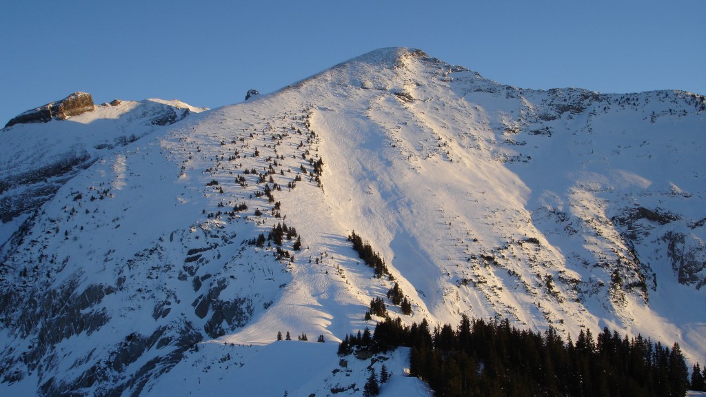 The picture below (taken from Fliegenspitz) shows the North side of Leistkamm. The ascent route is to the left through the small trees and then on the ridge. The descent follow usually the same route. But in good conditions one can also ski down the steep slope to the right (about 35-40 degrees).